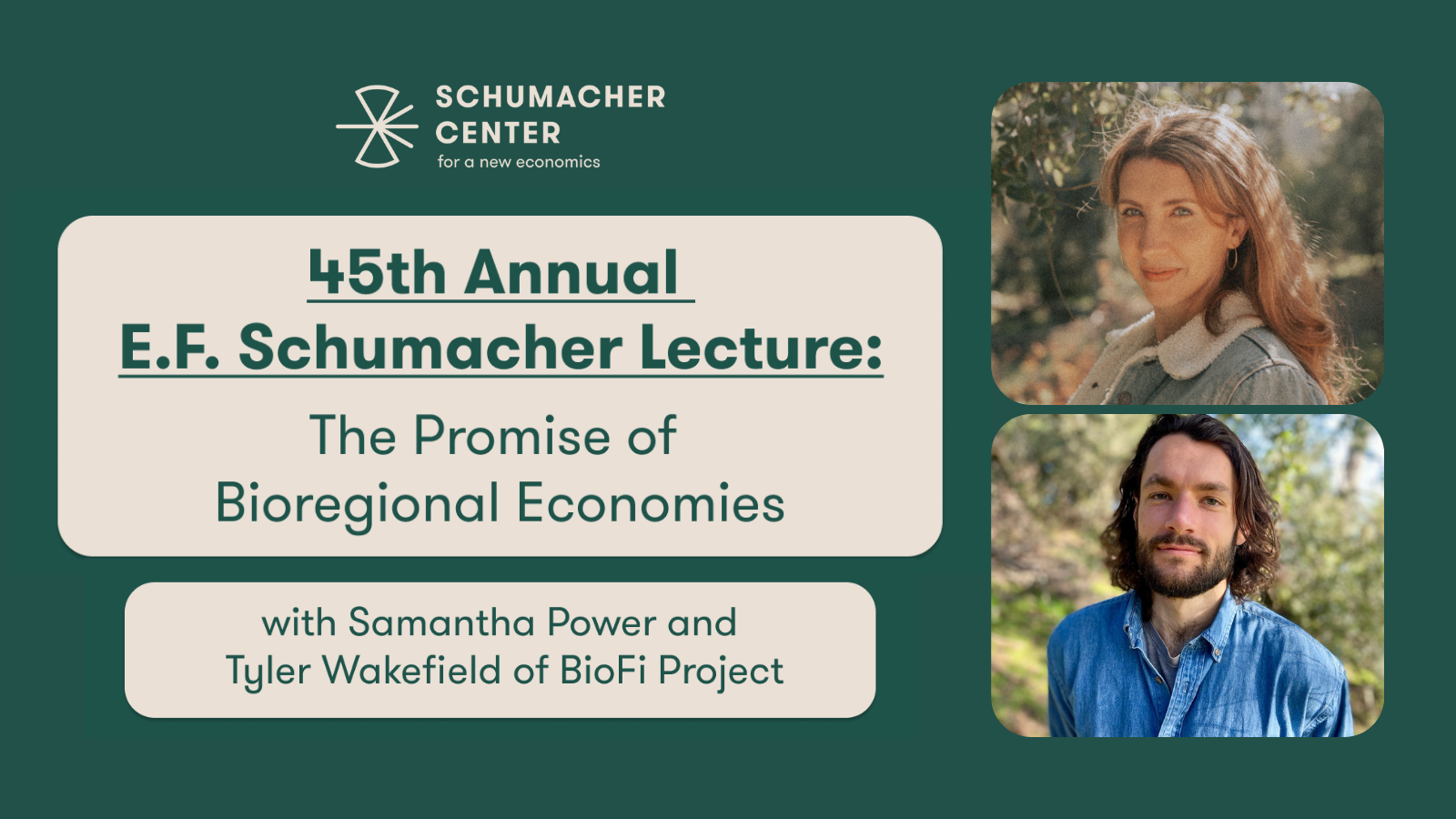 On November 22nd, 2025 at 3PM, the Schumacher Center will gather key leaders of the contemporary Bioregional movement to discuss strategies for financing the New Economy. Samantha Power and Tyler Wakefield, Co-Founders of BioFi Project, will engage in a conversation led by Schumacher Center board member, Alex Forrester, around the “Promise of Bioregional Economies.”